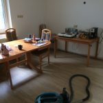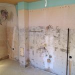 Bei der Gelegenheit versetzte ich die Anschlüsse für das Waschbecken an die geplante Stelle und verlegte auch gleich Leitungen für das neue Badezimmer im Dachgeschoß. Dann noch Steckdosen versetzen, die Stromleitung für den Herd verstecken, wo notwendig verputzen (nicht gerade meine Lieblingsarbeit!) und schließlich ausmalen. Den neuen Vinylboden zu verlegen war dann nur mehr eine Kleinigkeit.